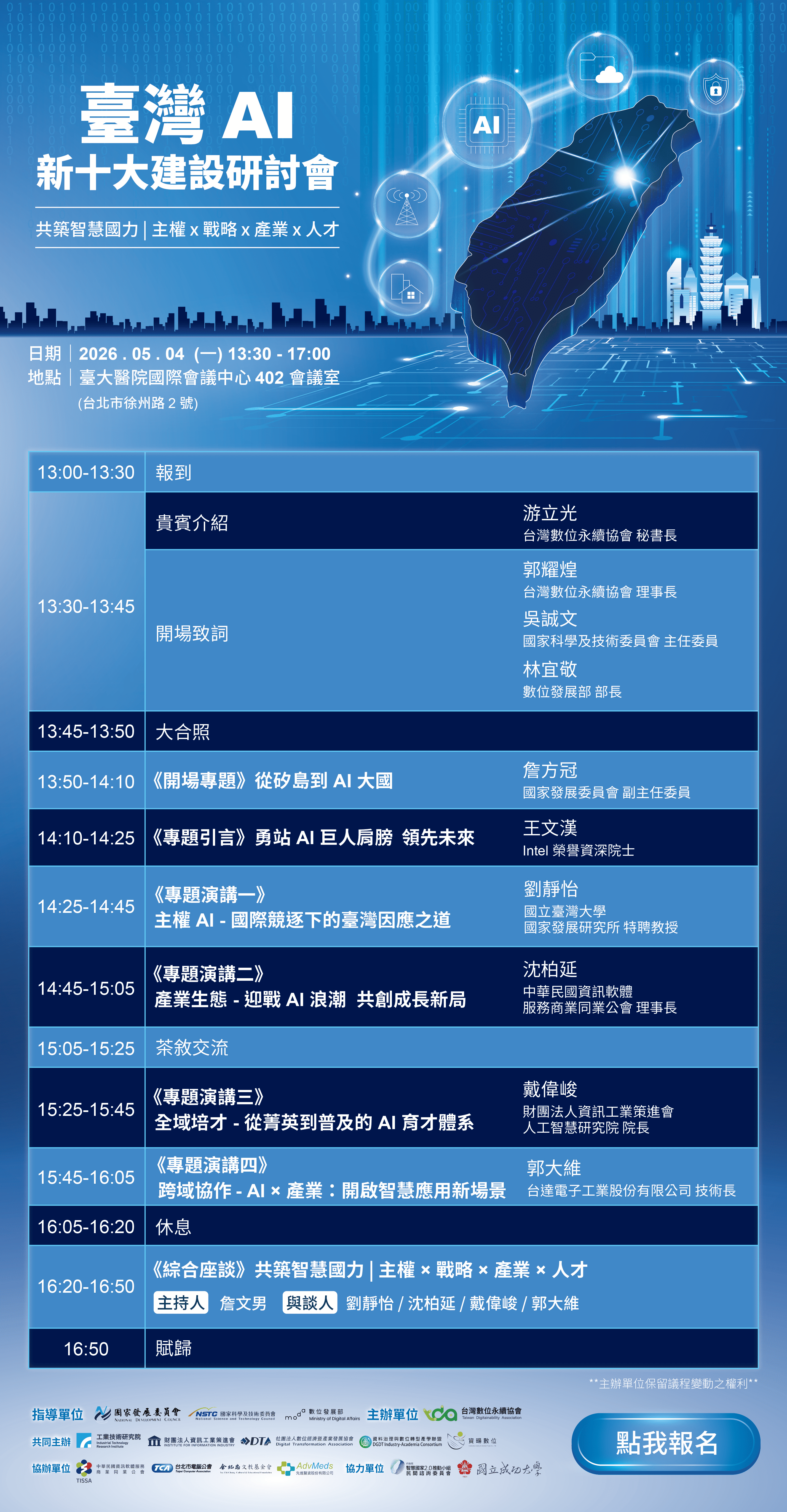 誠摯邀請關心人工智慧、數位政策與產業發展的各界先進共襄盛舉,一同交流觀點、激盪新思維,共同關注臺灣推動「AI新十大建設」的重要發展里程碑。精彩可期,敬邀蒞臨參與。