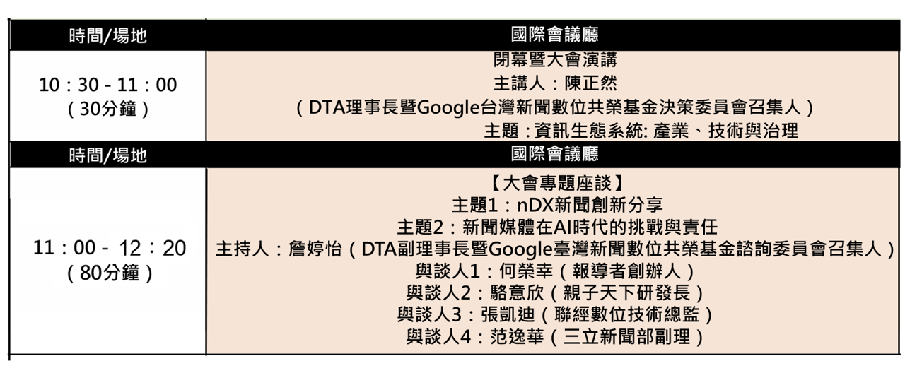 隨後,從11:00至12:20,將進行主題為「新聞媒體在AI時代的挑戰與責任」的專題座談。由DTA副理事長暨Google台灣新聞數位共榮基金諮詢委員會召集人詹婷怡主持,並有來自各領域的專家參與,包括報導者創辦人何榮幸、親子天下研發長駱意欣、聯經數位技術總監張凱迪以及三立新聞部副理范逸華。此環節將先由4位專家分享nDX新聞創新經驗,接著由主持人帶領,深入探討AI技術如何塑造新聞產業的未來,以及相關的倫理、技術和政策挑戰。