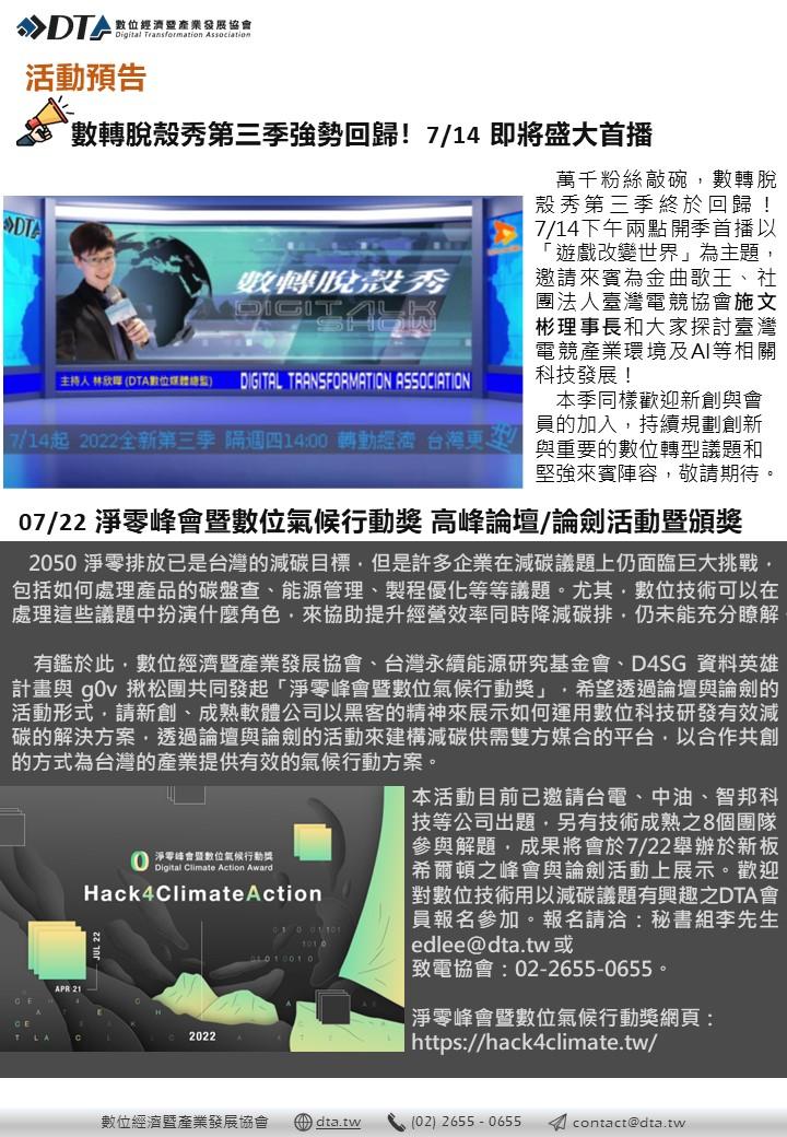 - 7/22 淨零峰會暨數位氣候行動獎 高峰論壇/論劍活動暨頒獎