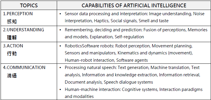 按照AI能力模仿人類能力假設,大致可以分為感知(perception)、理解(understanding)、行動(action)和溝通(communication)這幾個核心領域。